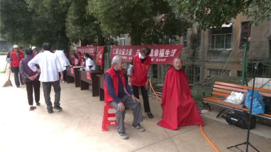 在江夏金水社区休闲广场上,社区工作人员和志愿者们搭起了一个简易便民集市,为前来参加活动的市民免费提供衣物缝补、理发、修眉等等各类生活服务。来自金口卫生院的医务人员免费为群众量血压,并解答患者的各种问题,并对居民就如何通过改善饮食习惯来提高自身素质进行现场指导。