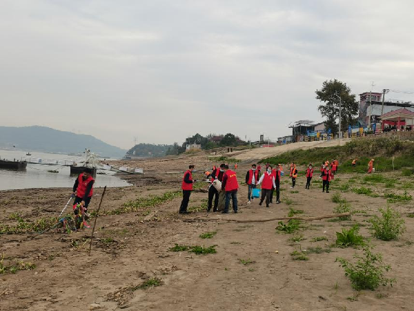 在金口街海事码头内,大家身穿“志愿红”,沿岸对江边的白色垃圾、烟蒂、杂物等进行清理,清理岸线长度2公里有余。同时,志愿者们还向附近居民宣传环保理念,促进长江沿线生态环境保护。