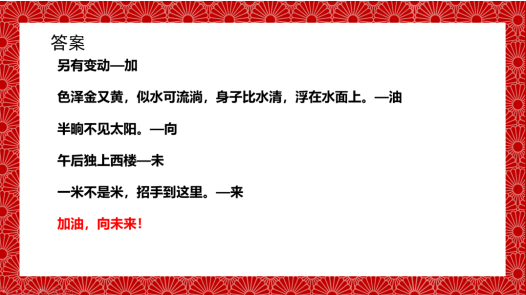 最后,在大家的期待中,庆元宵趣味活动开始啦!欢乐猜谜语,喜庆闹元宵。几个精心准备的谜语调动起了所有青年干警的兴趣,青年干警们既收获了快乐,又得到了诸如大白兔奶糖、棒棒糖、娃哈哈等富有童真童趣的小奖品!细心的小伙伴发现,将几个字谜的谜底拼起来,是“加油,向未来!”希望在新的一年里,所有的社员越来越棒,启迪学社越来越好!