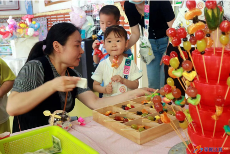民俗庙会人头攒动,吆喝声此起彼伏。庙会由各班家长志愿者承办,分为四大区传统饮食品尝区、传统文化展示、传统游戏体验区、民俗跳蚤市场,共48个摊位。家长孩子齐动手,精心布置摊位,萌娃们全力推销自己的产品:粽子、糖葫芦、串串香、糖水、香囊、投壶、编织、套圈……跟着欢快的音乐,家长和孩子们边吃边逛边玩,打卡精彩瞬间,共绘童年记忆。