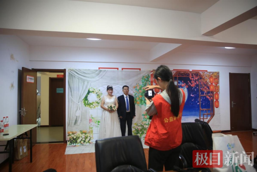 “阿姨、叔叔往里靠一点”“叔叔,看着阿姨的眼睛”……随着摄影师快门按下的声音,陈小双,蔡俊平两位老人依偎在一起,露出幸福的笑容,一张浪漫的婚纱照定格住他们的浪漫瞬间。